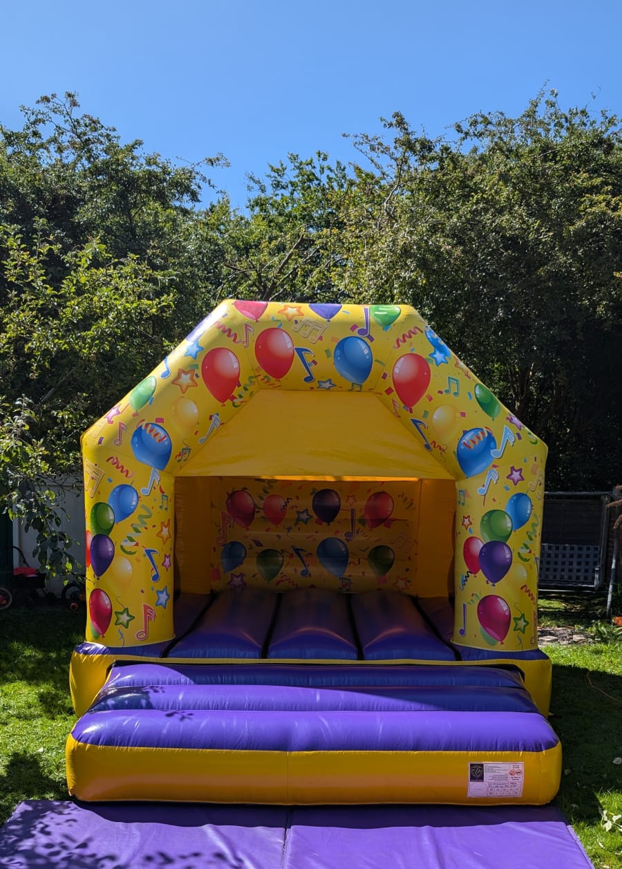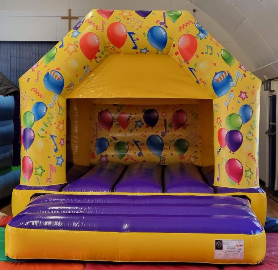 Unlock Vibrant Celebrations with Our Yellow and Purple High Gloss Party Time Bouncy Castle - Available for Hire in Stockport, Manchester, Tameside, Altrincham, Wilmslow & Oldham!