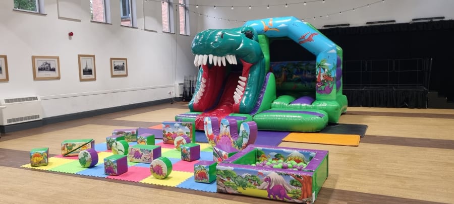 Dinosaur soft play set with 3D Dino castle is for hire In Atrincham, Bowdon, Hale and Hale Barns.