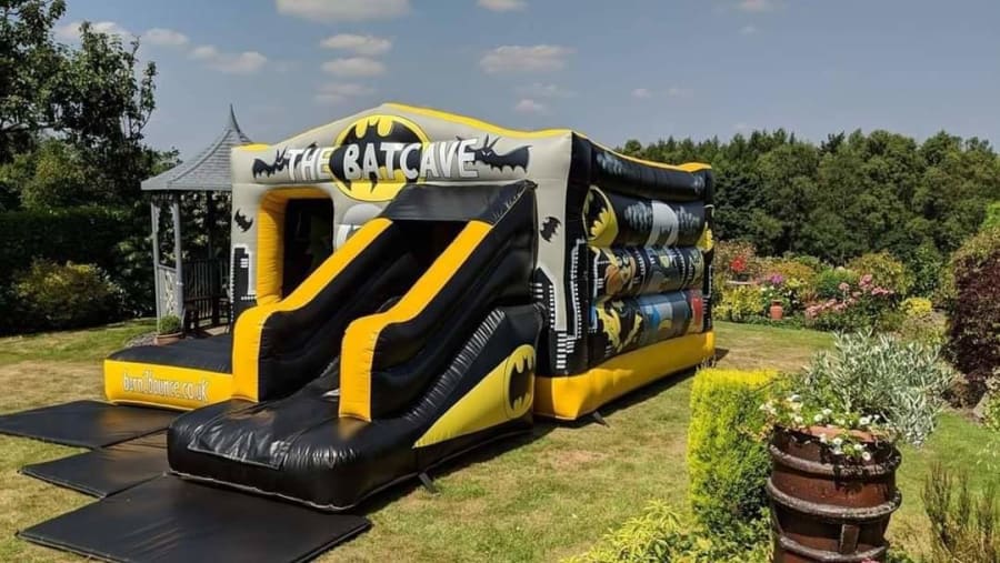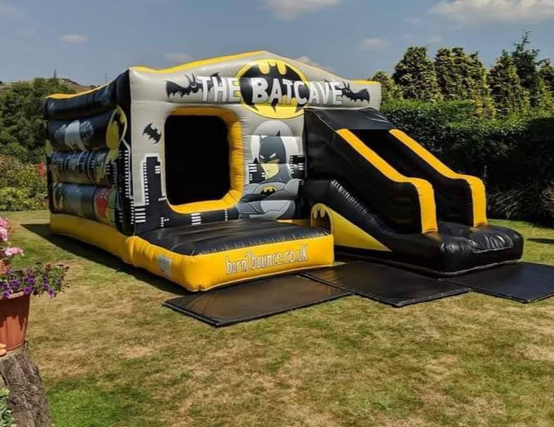 🦇 Gotham Adventure Awaits: Bat Cave Bouncy Castle/Slide Combo Hire in Stockport, Tameside, Manchester, Wilmslow, Altrincham, and Oldham! 🌃⚔️