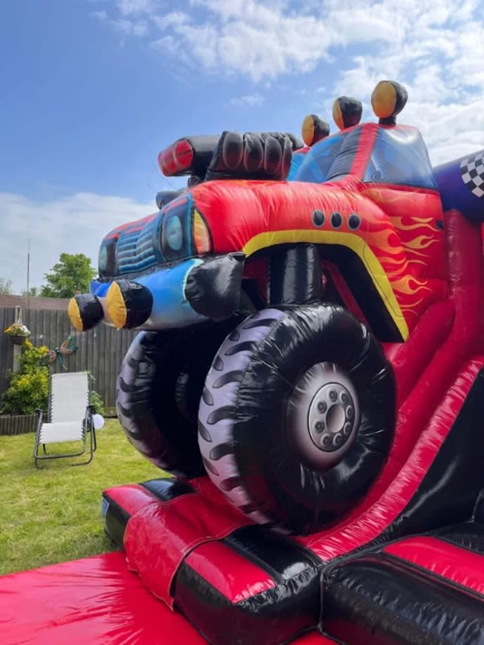 This 3D Monster Truck bouncy castle slide combo is available for hire Tameside, Ashton Under Lyne, Dukinfield, Hyde, Stalybridge, Audenshaw, Denton, Droylsden, Mossley, Haughton Green.