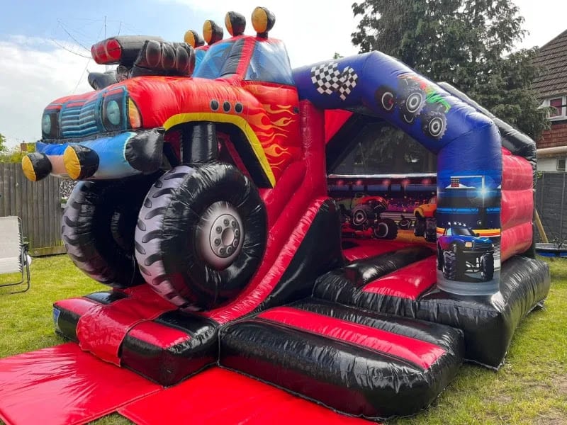 Our 3D Monster Truck Bouncy Castle/Slide Combo is ready to bring the WOW factor to your events in Stockport, Wilmslow, Altrincham, Manchester, Tameside, and Oldham. Whether it’s a birthday party, christening, family get together, this inflatable guarantees to be a hit with young adventurers.