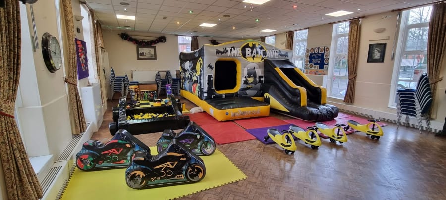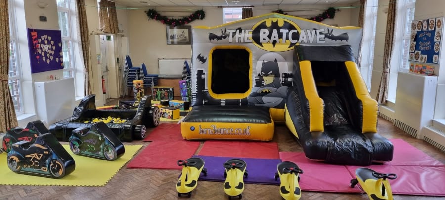 Servicing Stockport, Tameside, Wilmslow, Altrincham, Manchester, and Oldham, our team delivers and sets up the Batman Superhero Soft Play set and Batcave Bouncy Castle, guaranteeing a hassle-free experience for you and an unforgettable adventure for the little ones.